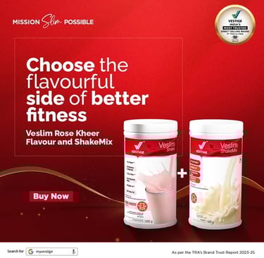 Vestige Veslim Shake is a low-calorie, meal-replacement drink mix designed to help with weight management. It provides essential nutrition — including approximately 9–10 g of protein, around 4 g of fibre and over 20 vitamins and minerals per serving — without excess fats or calories. vestbuy.in+1 Flavor options include Mango, Vanilla, Rose Kheer and Kulfi. vonlineteam.com+1 To use: mix one scoop (~30 g) with about 200 ml of water or milk, and consume up to twice daily. The product is intended to support you in maintaining or reducing weight when combined with a balanced diet and exercise regimen.